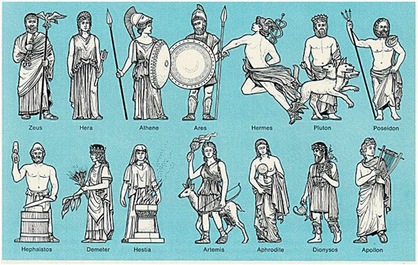 Antiiksetel jumalatel on seega küll üleloomulikud võimed kuid ka inimlikud nõrkused ning nendega saab manipuleerida. Nende vahel valitsevad keerulised suhted. Allpool on toodud Vanakreeka mütoloogia hierarhia kõige ülemisse tippu kuuluvad tegelased. Sulgudesse on märgitud jumalate nimede roomakeelne vaste, suure osa Vanakreeka jumalustest võtsid roomlased sarnaselt nt. kunstiga enda kultuuri üle.